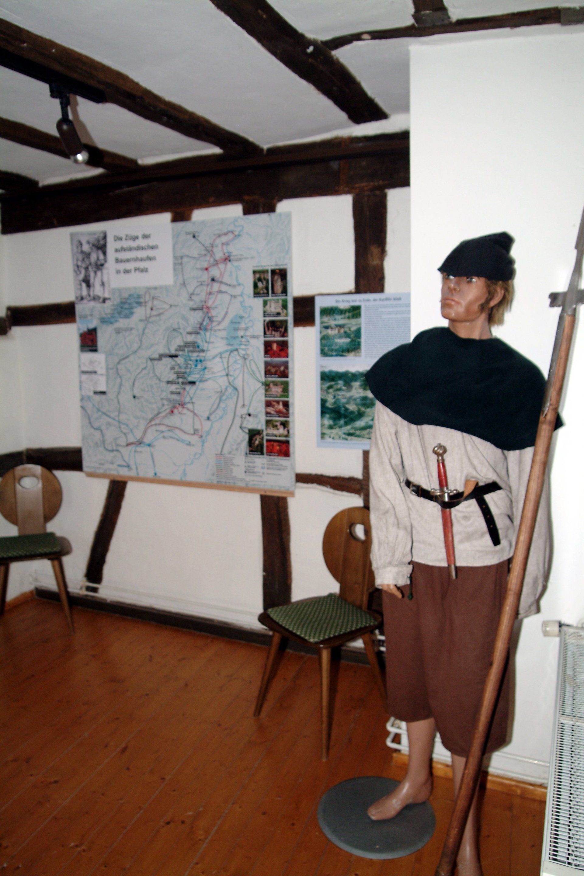 Foto: Ausschnitt aus dem Bauernkriegsmuseum: Bauer mit Lanze und typischer Kleidung; dahinter große Tafel, die die Ausbreitung des pfälzischen Bauernkriegs – ausgehend von Nußdorf – darstellt.