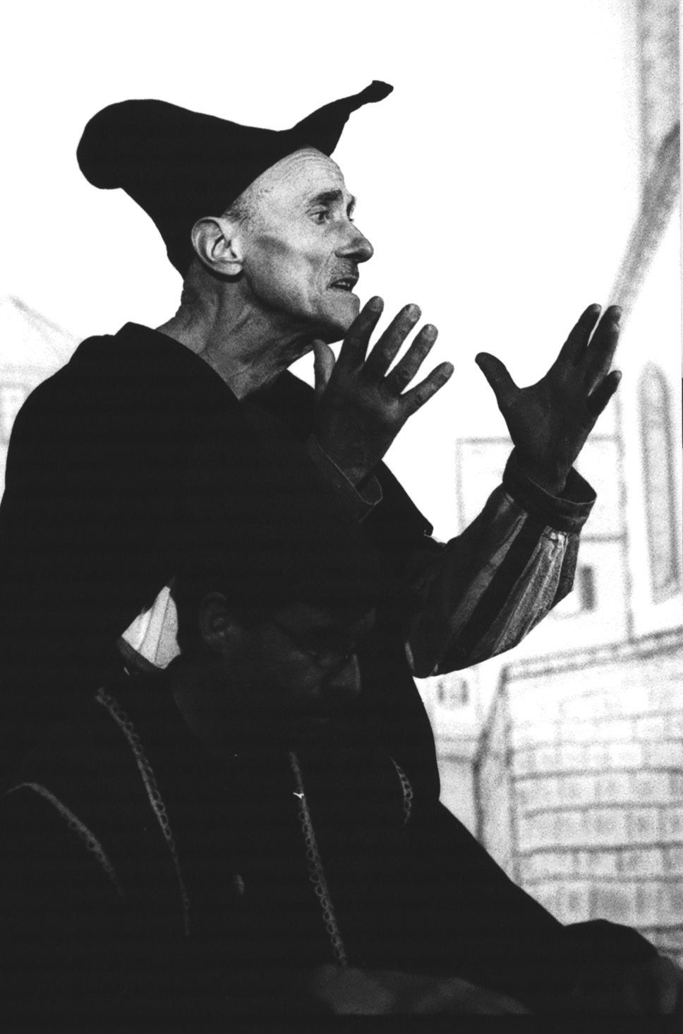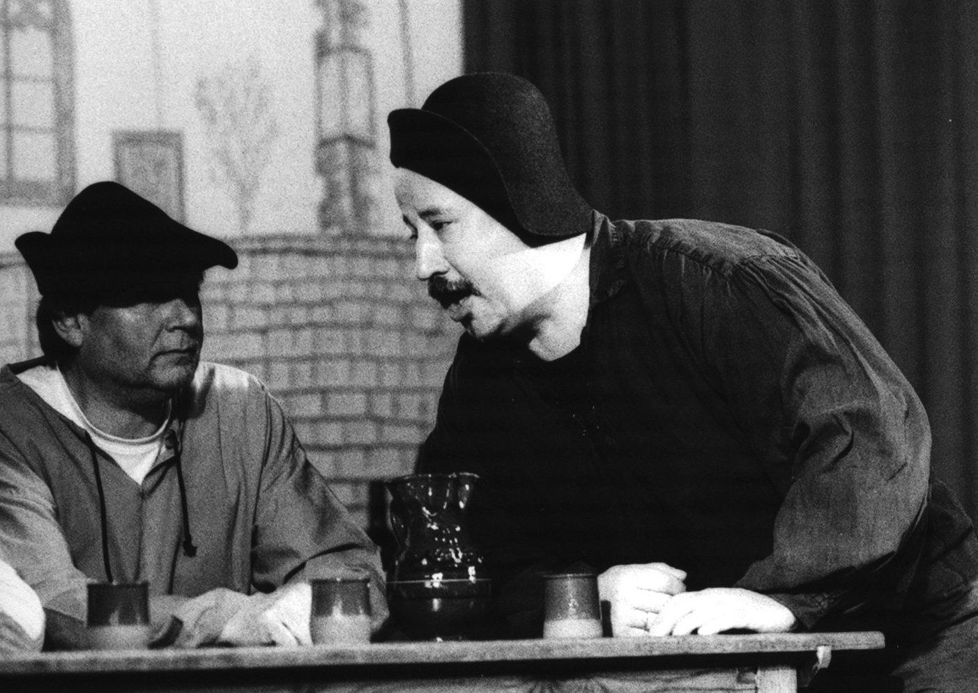 Foto links und oben: Theaterstück zum Verkauf von Nußdorf an die Stadt Landau. Nußdorfer Bauern beklagen sich über ihre Situation und spekulieren, ob und welche Veränderungen der Wechsel ihres Herren für sie bringen wird. Aufführung in der Turnhalle Nußdorf, 2008. Regie: Annette Zehr. Spieler: Foto links: Kurt Hutzel, Foto rechts: Rainer Wambsganss (l.) und Wolfgang Dietl (r.). Fotos: Mihrican Özdem